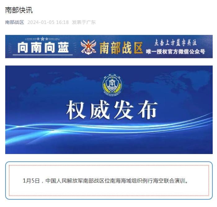 中新網(wǎng)1月5日電 據(jù)南部戰(zhàn)區(qū)微信公眾號(hào)消息,1月5日,中國(guó)人民解放軍南部戰(zhàn)區(qū)位南海海域組織例行??章?lián)合演訓(xùn)。