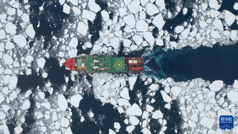 北京時(shí)間1月6日,執(zhí)行中國(guó)第40次南極考察任務(wù)的“雪龍2”號(hào)在阿蒙森海為潛標(biāo)布放開(kāi)辟水道(無(wú)人機(jī)照片)。新華社發(fā)(陳棟彬 攝)