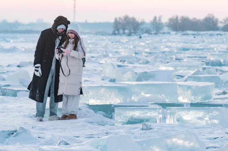 1月7日,在封凍的松花江哈爾濱段,游客在“鉆石?!庇瓮妗P氯A社記者謝劍飛攝