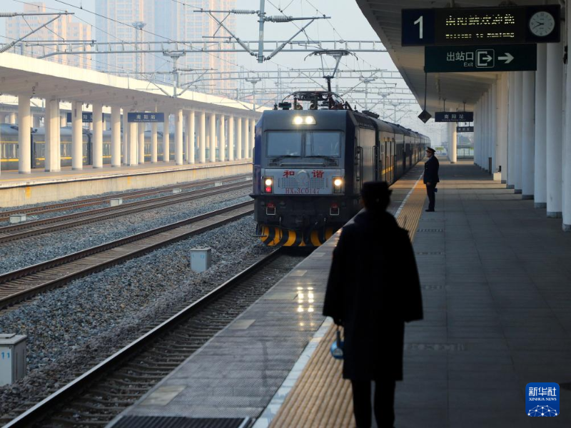 1月10日,在河南省南陽市,一列列車駛?cè)肽详柣疖囌尽?/p>