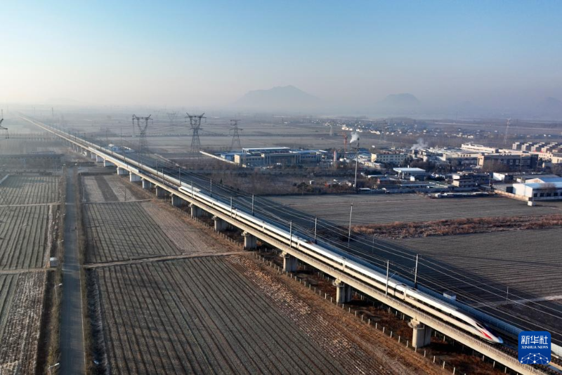 1月10日,一列動車組列車在山東省鄒城市大束鎮(zhèn)境內(nèi)行駛(無人機照片)。