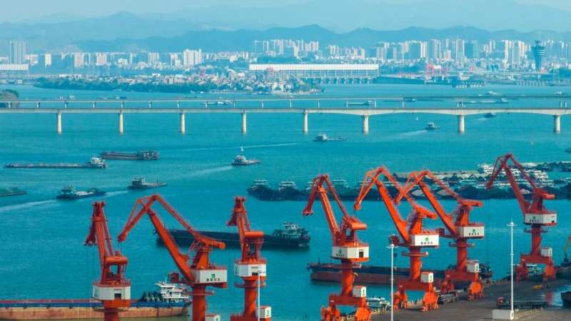 1月3日,在廣西梧州臨港經(jīng)濟(jì)區(qū)赤水港碼頭,工人操作設(shè)備在碼頭上進(jìn)行裝卸作業(yè)(無人機(jī)照片)。新華社發(fā)(何華文攝)