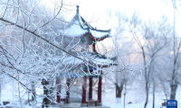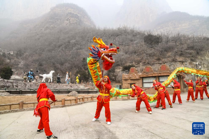 1月14日,河南省濟源市五龍口景區(qū)工作人員在表演舞龍。