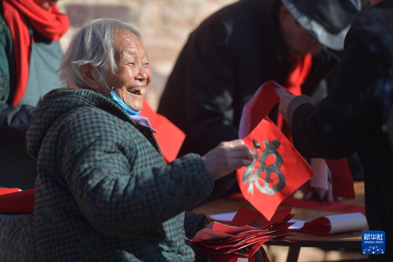 1月14日,在河北省石家莊市井陘縣東尖山村,村中老人拿著書法愛好者送來的新春福字。