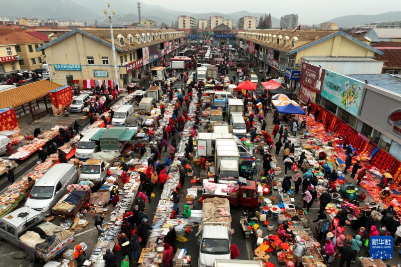 1月14日,在山東省青島市嶗山區(qū)王哥莊年貨大集上,人們逛集市、置辦年貨(無人機照片)。