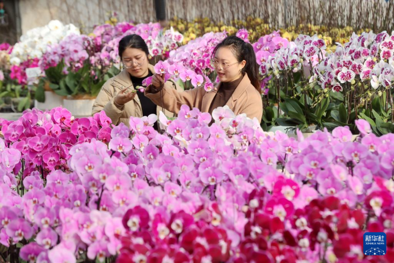 1月14日,在浙江省湖州市德清縣莫干山鎮(zhèn)高峰村花卉種植基地,市民選購蝴蝶蘭。