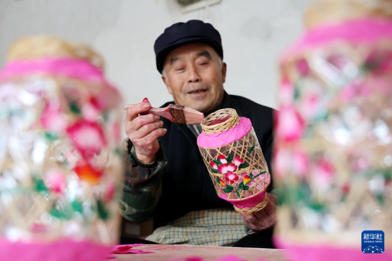 1月14日,山東省濱州市的手工藝人在用彩紙裱糊手扎燈籠。