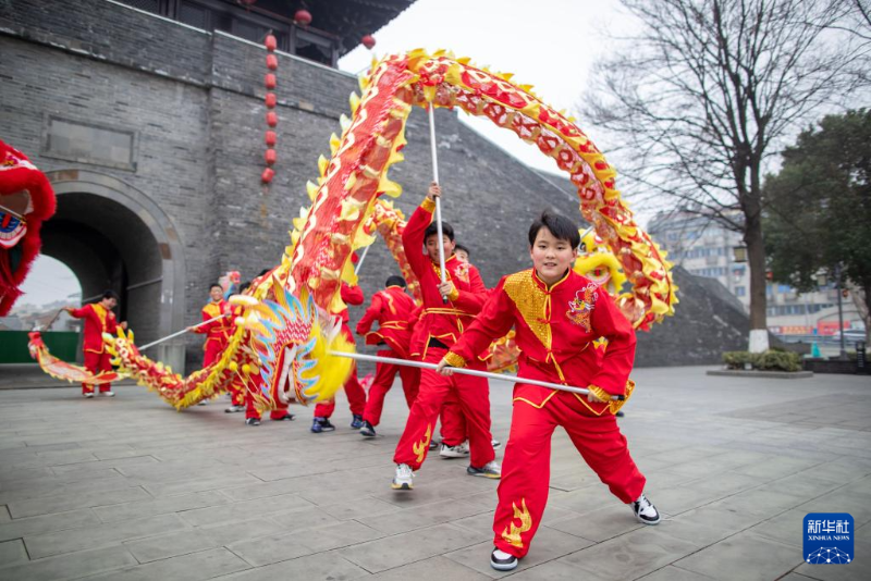 1月14日,在江蘇省興化市昭陽街道北門街區(qū)廣場,新生中心小學(xué)的學(xué)生在練習(xí)舞龍。