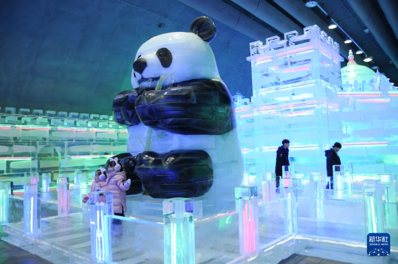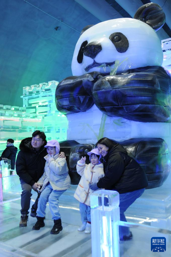 1月13日,在韓國(guó)江原道的華川山鱒魚(yú)節(jié)現(xiàn)場(chǎng),游客在哈爾濱工匠制作的大熊貓冰雕作品前留影。