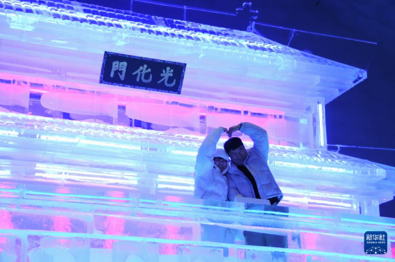 1月13日,在韓國(guó)江原道的華川山鱒魚(yú)節(jié)現(xiàn)場(chǎng),游客在哈爾濱工匠制作的韓國(guó)光化門(mén)冰雕作品前留影。