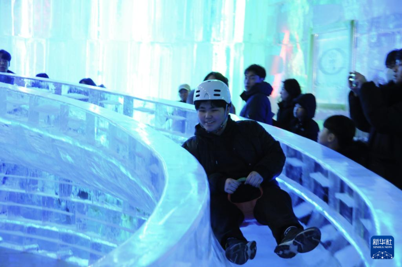 1月13日,在韓國(guó)江原道的華川山鱒魚(yú)節(jié)現(xiàn)場(chǎng),游客體驗(yàn)哈爾濱工匠制作的冰滑梯。