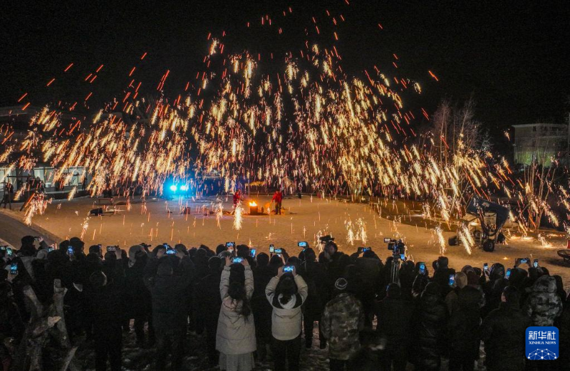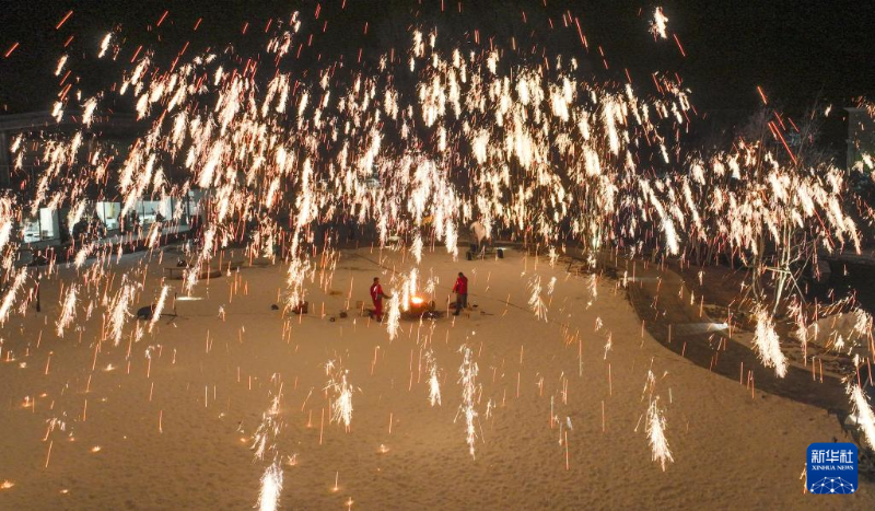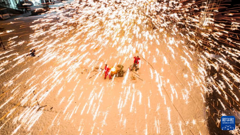 1月13日,民間藝人在河北省承德市興隆縣一景區(qū)為游客表演“打樹花”(無人機照片)。