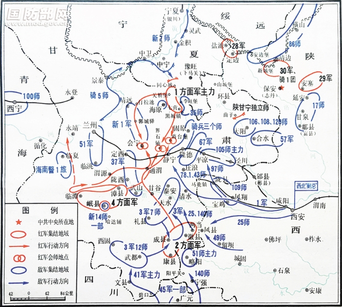 遵照黨中央和軍委的上述部署,紅一方面軍之西方野戰(zhàn)軍主力,于31日由豫旺堡南北地區(qū)向西出動,迅速控制了中寧至固原大道以西、海原以東地區(qū)。隨后,紅一軍團以第1師(欠第13團)附騎兵第2團一部組成特別支隊,在軍團政治委員聶榮臻率領(lǐng)下,經(jīng)硝河城向南挺進(jìn),于9月14日占領(lǐng)將臺堡;紅十五軍團以第73師和騎兵第3團組成另一個特別支隊,向靖遠(yuǎn)挺進(jìn),亦于14日占領(lǐng)打拉池。紅四方面軍截至9月7日止,攻占了漳縣、臨潭、渭源、通渭四座縣城,以及岷縣、隴西、臨洮、武山等縣廣大地區(qū),并包圍了岷縣縣城。紅二方面軍于9月11日從哈達(dá)鋪附近出動,至19日,先后攻占了成縣、徽縣、兩當(dāng)、康縣等地。這樣紅二、紅四方面軍就與紅一方面軍形成了夾西(安)蘭(州)大道南北呼應(yīng),并可隨時會師的有利態(tài)勢。