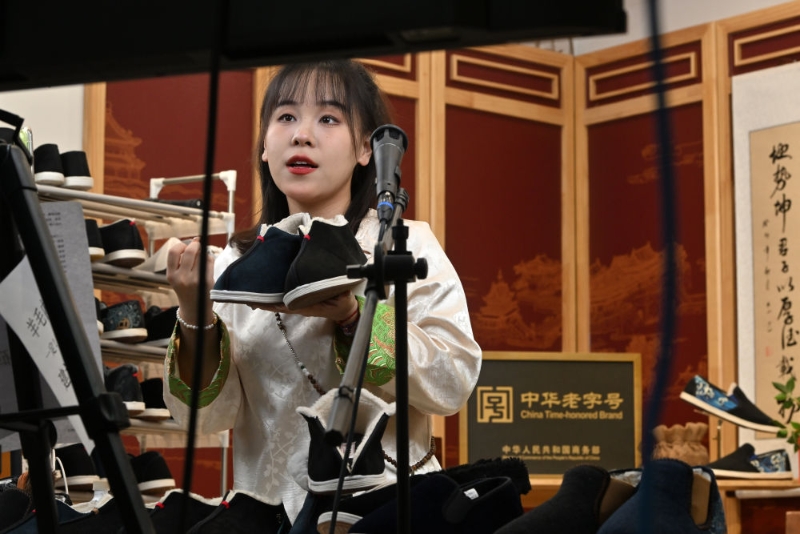 2023年12月8日,主播在老美華的直播基地內(nèi)帶貨。老美華始創(chuàng)于1911年,歷史上以“千層底”布鞋聞名,是享譽津門的“中華老字號”。新華社記者 李然 攝