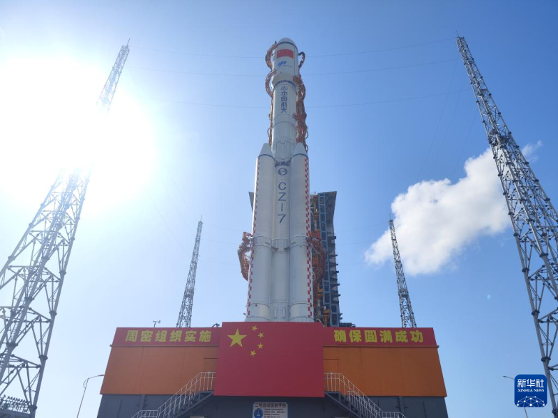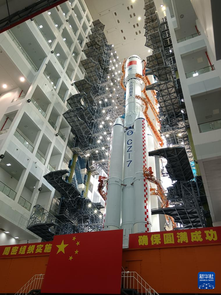 當(dāng)日,天舟七號(hào)貨運(yùn)飛船與長(zhǎng)征七號(hào)遙八運(yùn)載火箭組合體垂直轉(zhuǎn)運(yùn)至發(fā)射區(qū)。