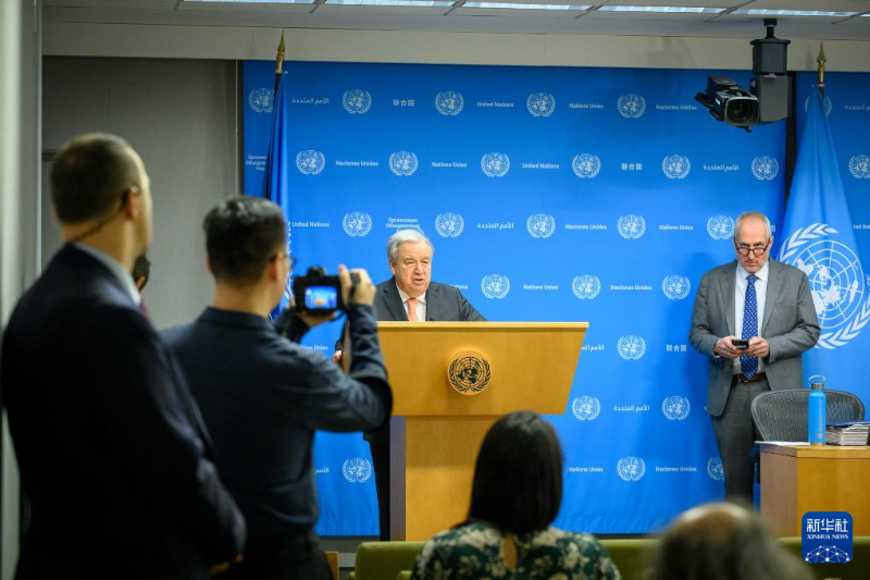 1月15日,在位于紐約的聯(lián)合國總部,聯(lián)合國秘書長古特雷斯(后左)向媒體宣讀聲明。