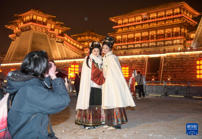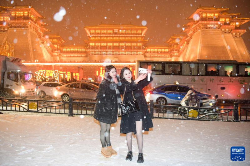 1月15日,在洛陽市隋唐洛陽城應(yīng)天門遺址博物館,游客在雪中拍照。