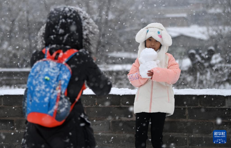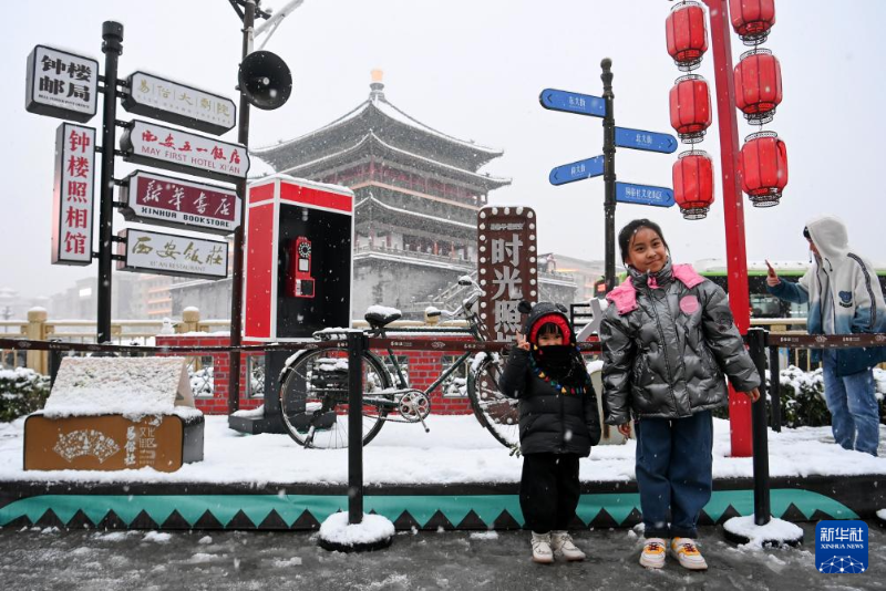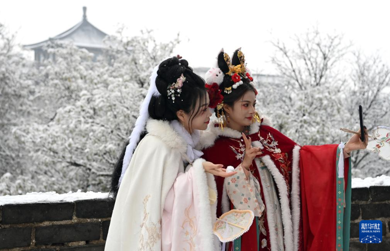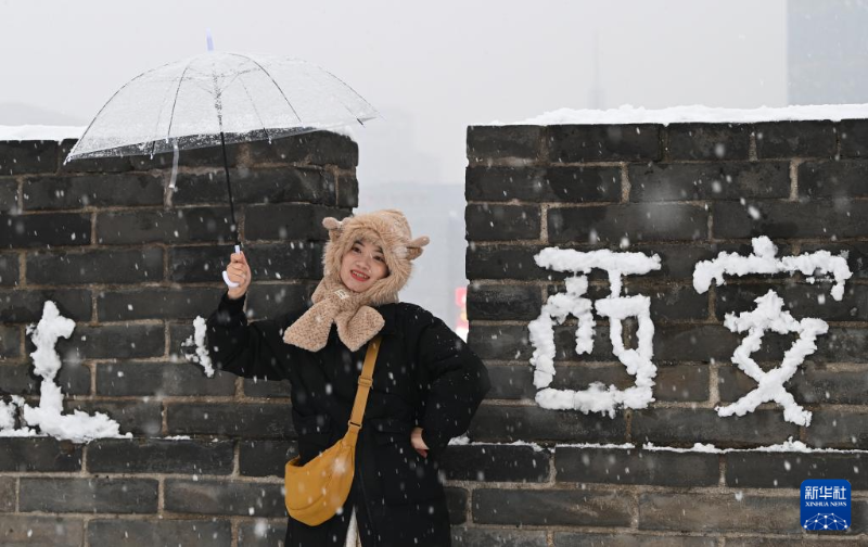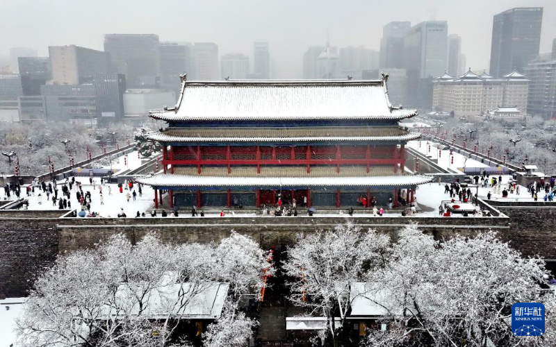1月16日,游客在西安城墻觀景賞雪(無人機(jī)照片)。