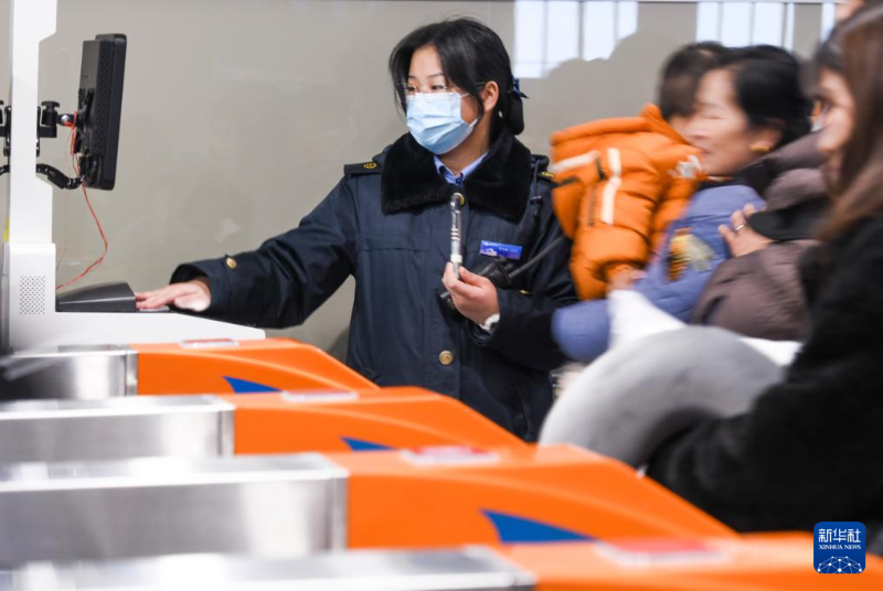 1月17日,在烏魯木齊站,鐵路工作人員在引導乘客有序進入候車大廳。