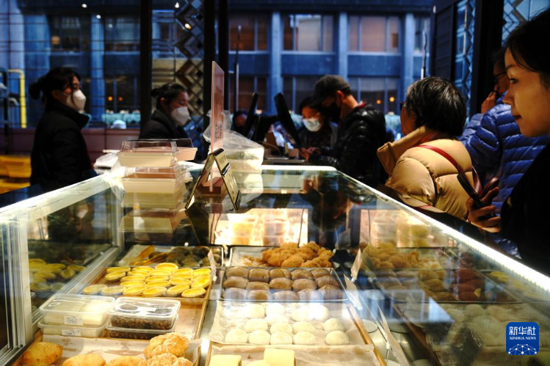 1月17日,消費者在上海黃河路購買糕點。