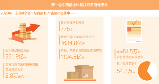 當(dāng)前,東西部協(xié)作已成為鞏固拓展脫貧攻堅(jiān)成果和推進(jìn)鄉(xiāng)村全面振興的重要力量。2023年,東部8個(gè)省市向西部10個(gè)省區(qū)市投入財(cái)政援助資金231.9億元,協(xié)作雙方互派黨政掛職干部3045人、專業(yè)技術(shù)人才2.5萬人。在協(xié)作雙方共同努力下,一大批幫扶項(xiàng)目落地見效,釋放出澎湃動(dòng)能。