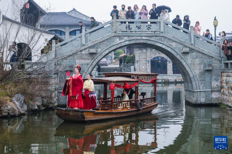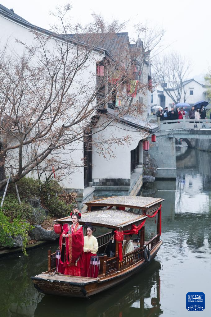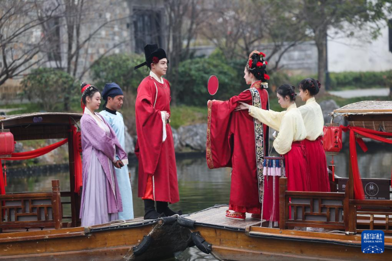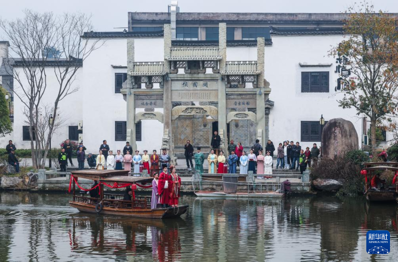 1月18日,中外青年身著傳統(tǒng)服飾在建德嚴(yán)州古城的船上體驗傳統(tǒng)水上婚禮習(xí)俗,包括出閣、梳妝、登船、親迎、禮拜等多個環(huán)節(jié)。