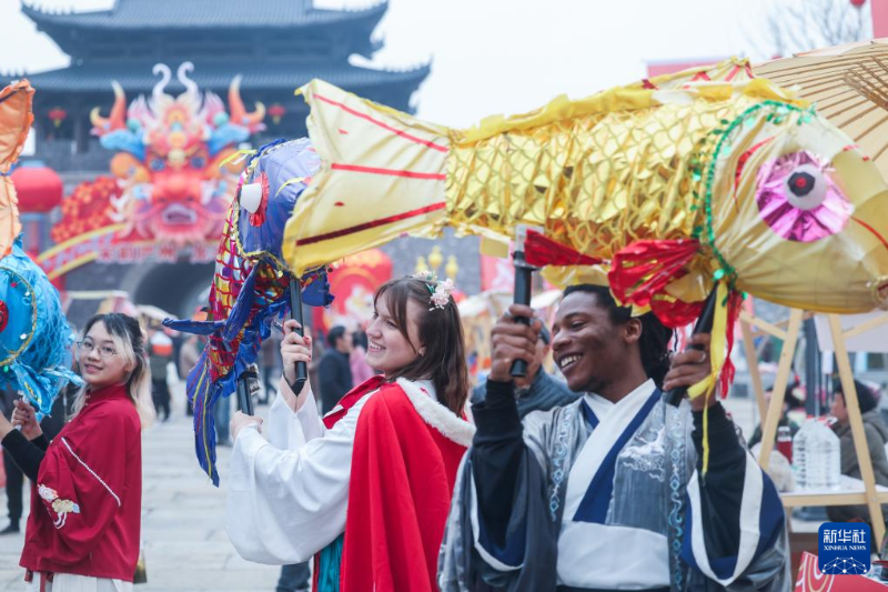 1月18日,中外青年身著傳統(tǒng)服飾在建德嚴(yán)州古城宋韻集市上體驗傳統(tǒng)魚燈。