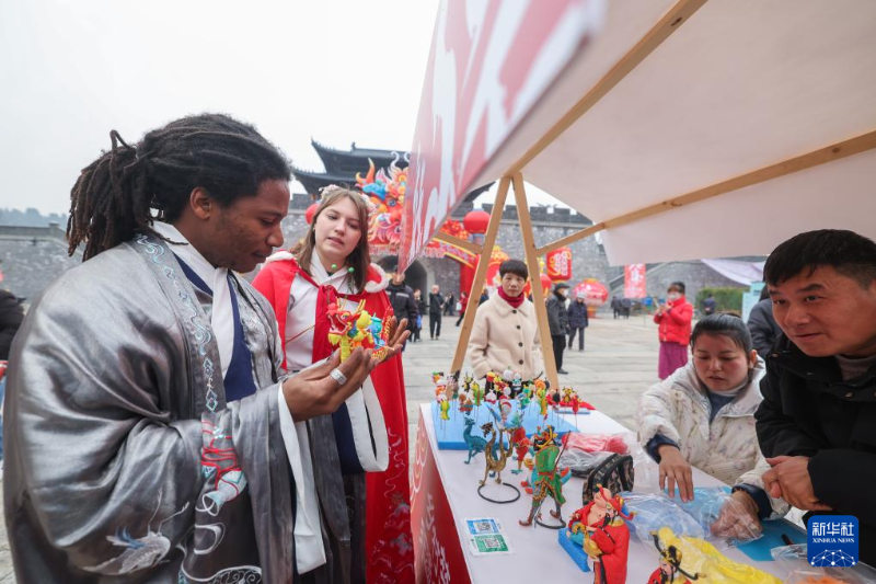 1月18日,中外青年身著傳統(tǒng)服飾在建德嚴(yán)州古城宋韻集市上觀看傳統(tǒng)米塑工藝品。