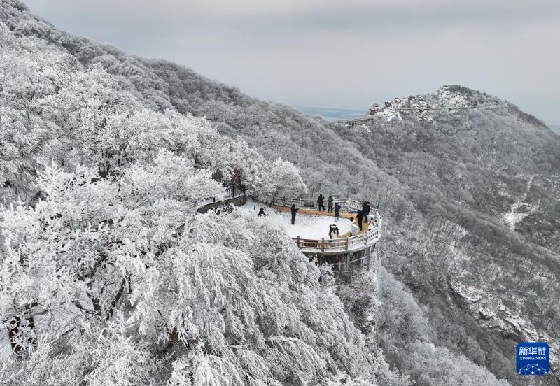 1月21日,游人在江蘇連云港市海上云臺山景區(qū)觀賞霧凇、雪凇疊加景色(無人機照片)。