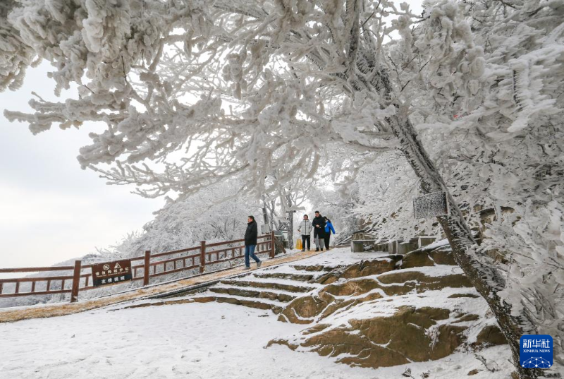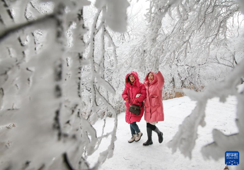 1月21日,游人在江蘇連云港市海上云臺山景區(qū)觀賞霧凇、雪凇疊加景色。
