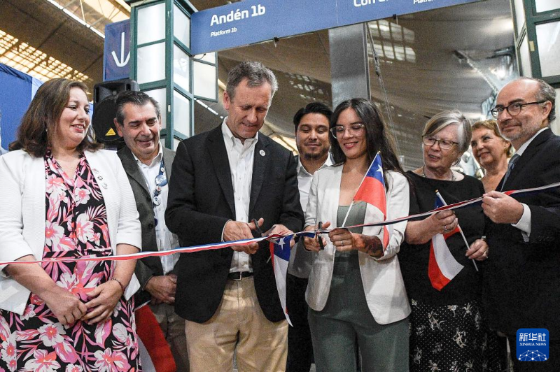 1月19日,智利交通電信部長穆尼奧斯(中左)等代表在圣地亞哥中央車站為新列車剪彩。