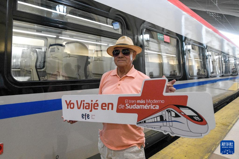 1月19日,在智利圣地亞哥中央車站內,一名乘客舉著“我乘坐了南美洲最現代列車”的標語與列車合影。