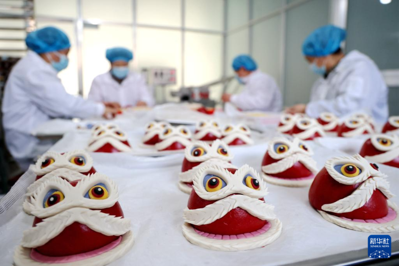 1月22日,在山東省濱州市陽信縣洋湖鄉(xiāng)一家花饃生產(chǎn)企業(yè)車間,工人加緊趕制“醒獅龍”花饃供應年貨市場。