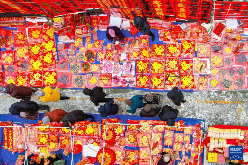 1月22日,人們在山東省青島市李村大集選購春節(jié)飾品(無人機照片)。