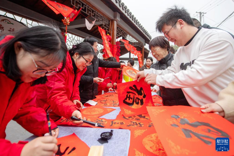 1月22日,在浙江省湖州市長興縣泗安鎮(zhèn)太平村文化禮堂外,村民領取“濃濃墨香情,福進千萬家”迎新送?;顒又驹刚邥鴮懙母W?。