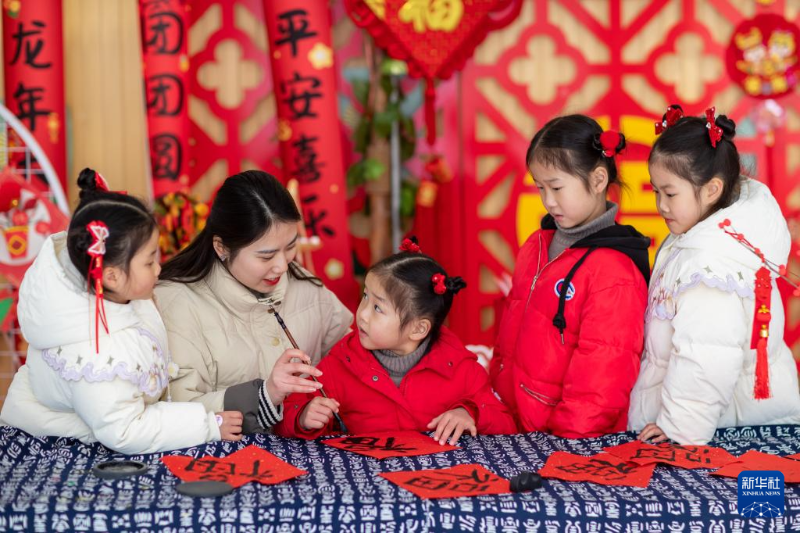 1月22日,在江蘇省興化市昭陽湖幼兒園,老師指導小朋友寫福字。