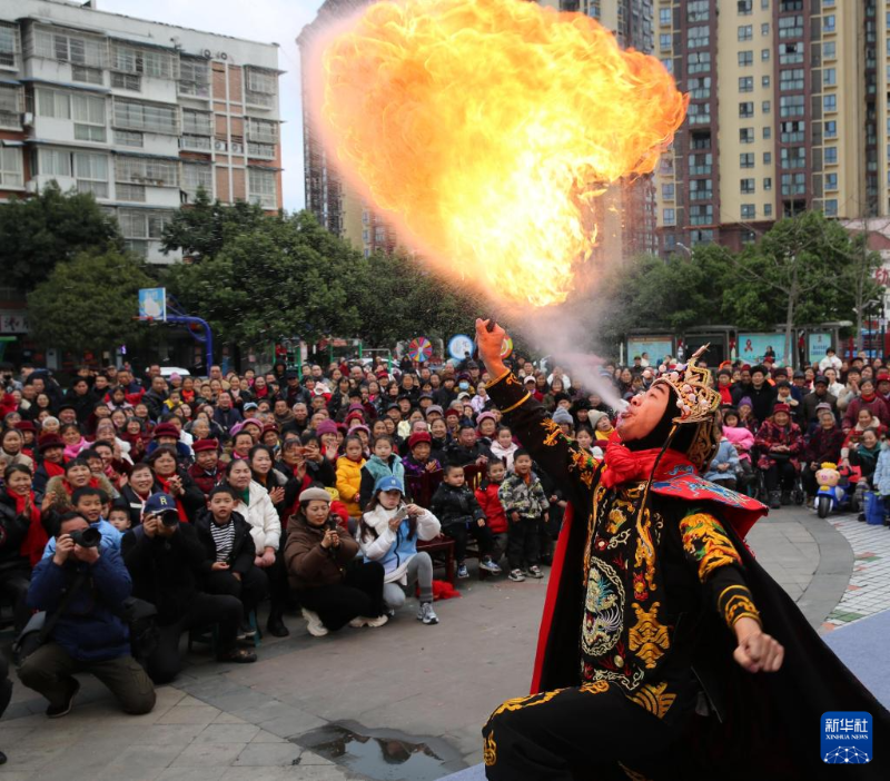 1月22日,演員在四川省眉山市東坡區(qū)尚義鎮(zhèn)七里社區(qū)表演川劇絕活吐火。