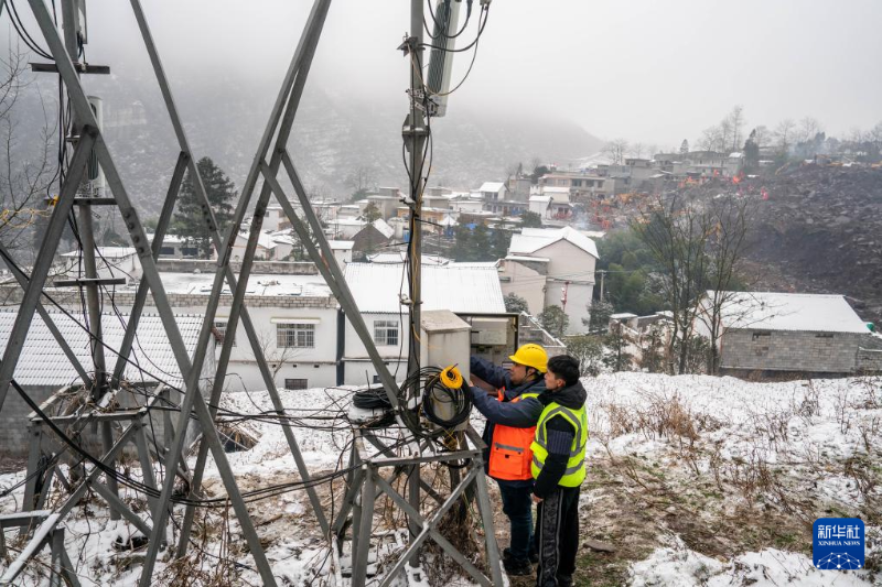 1月23日,工作人員在救援現(xiàn)場測試基站業(yè)務(wù)通信狀況。