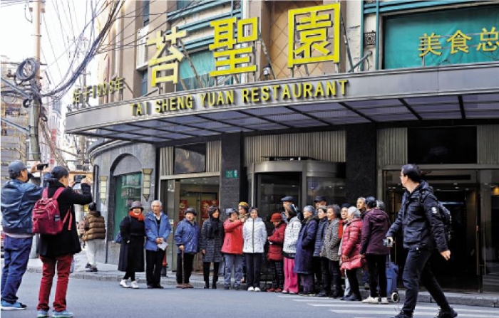 《繁花》劇中至真園酒家的原型位于上海市黃河路上的苔圣園酒家,吸引了不少市民游客前來打卡。圖片來源:中新社