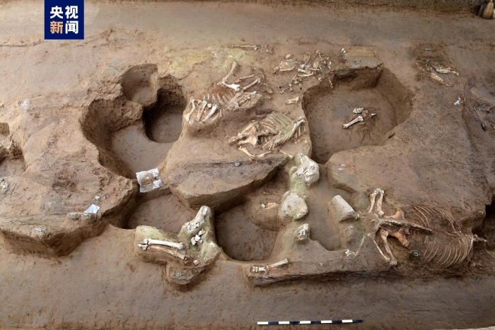 陪葬坑埋藏5組車(chē)馬,其中一組為羊車(chē),包括獨(dú)辀木車(chē)4輛,雙轅木車(chē)1輛。羊車(chē)為六羊,并列一排,骨骼保存完整。身上裝飾有類(lèi)似于駕馬的銅節(jié)約、帶扣、銅環(huán)等青銅馬具,顯示出處于駕車(chē)狀態(tài)——當(dāng)為羊車(chē)。羊骨身后車(chē)輛被破壞。