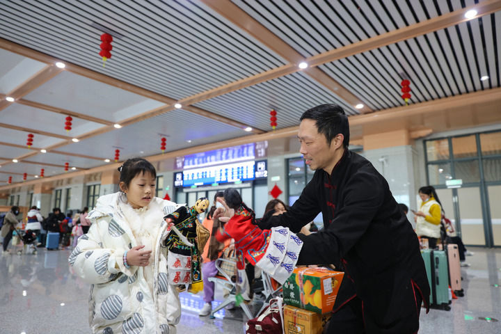 2024年1月26日,布袋木偶戲表演人員在福廈高鐵泉州南站候車室與小朋友互動。新華社記者 周義 攝