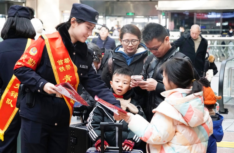 2024年1月26日,北京鐵路公安局民警在北京西站發(fā)放出行安全宣傳單。新華社記者 李欣 攝