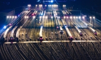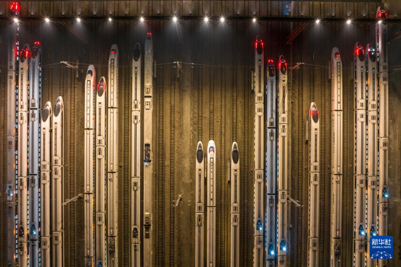 1月26日凌晨,完成檢修的動車組列車??吭诶ッ鲃榆囁鶅?nèi),整裝待發(fā)(無人機(jī)照片)。