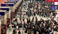 1月26日,旅客在天津濱海國際機(jī)場排隊辦理值機(jī)。