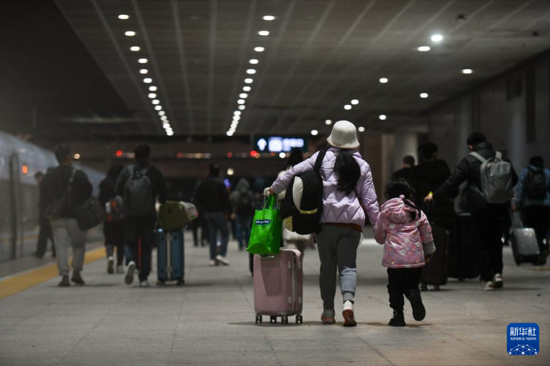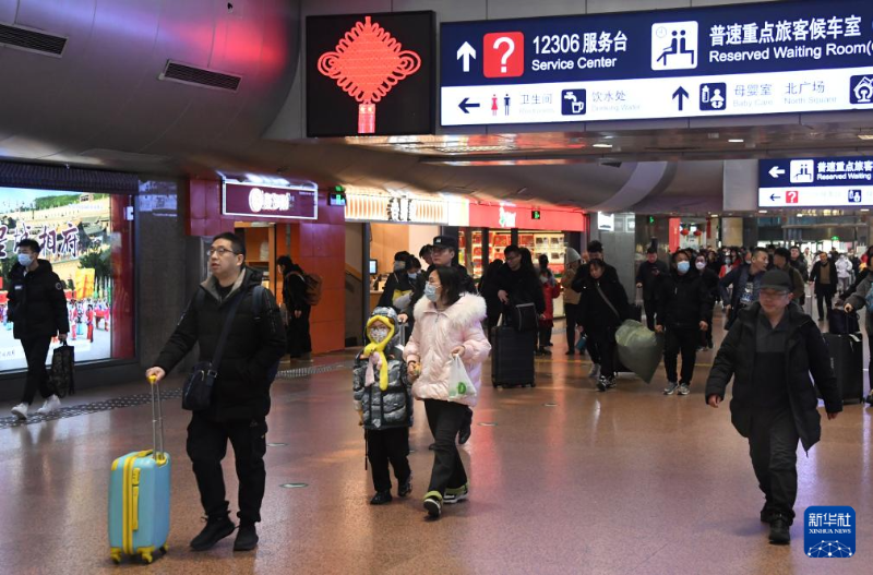 1月26日,在北京西站,乘坐G511次列車返回湖北老家的錢克怡(右三)與爸爸牽手準(zhǔn)備乘車。