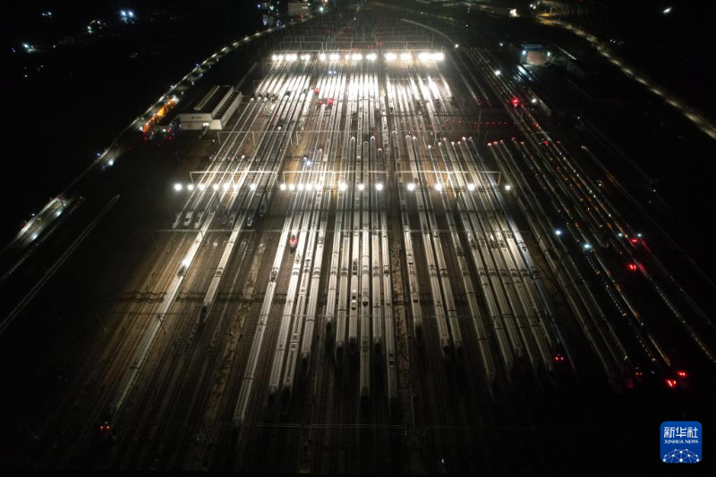 1月26日凌晨,動車組列車??吭谀暇﹦榆嚩文暇┠蟿榆囘\(yùn)用所存車線上(無人機(jī)照片)。