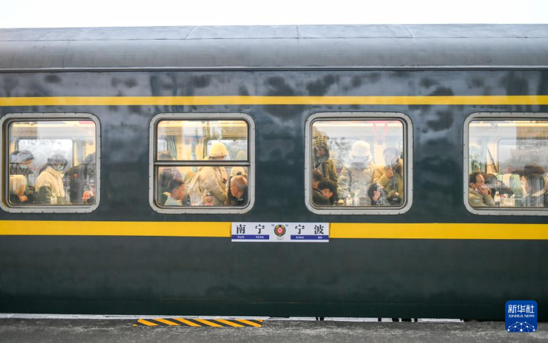 1月26日,在湖南省永州市道縣道州站,乘客在T582次列車上等候發(fā)車。