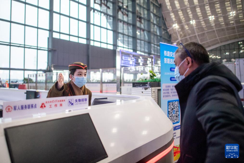 1月26日,在武漢站綜合服務(wù)中心,工作人員為旅客提供咨詢引導(dǎo)服務(wù)。