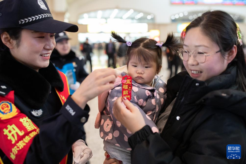 1月26日,在哈爾濱火車站候車大廳,哈爾濱鐵路公安局民警為旅客送上禮物。