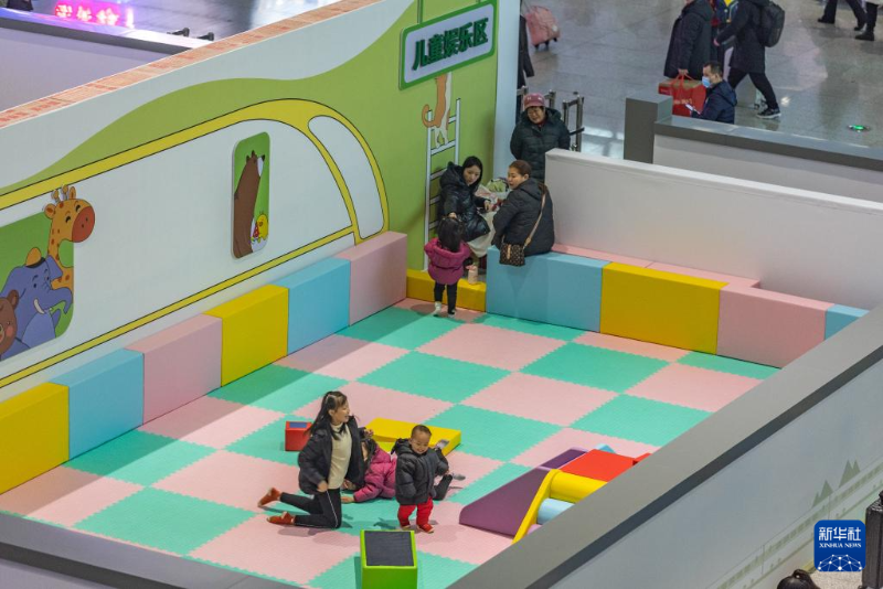 1月26日,在重慶北站候車大廳,小朋友在兒童娛樂區(qū)玩耍。